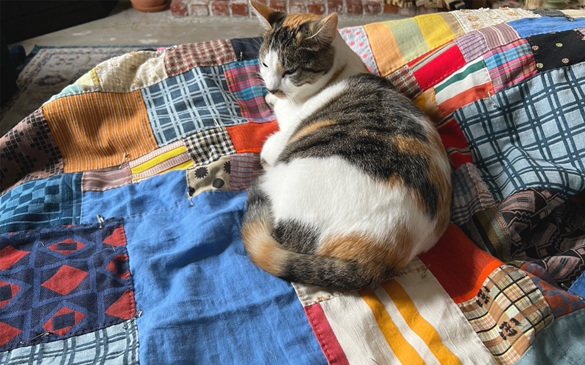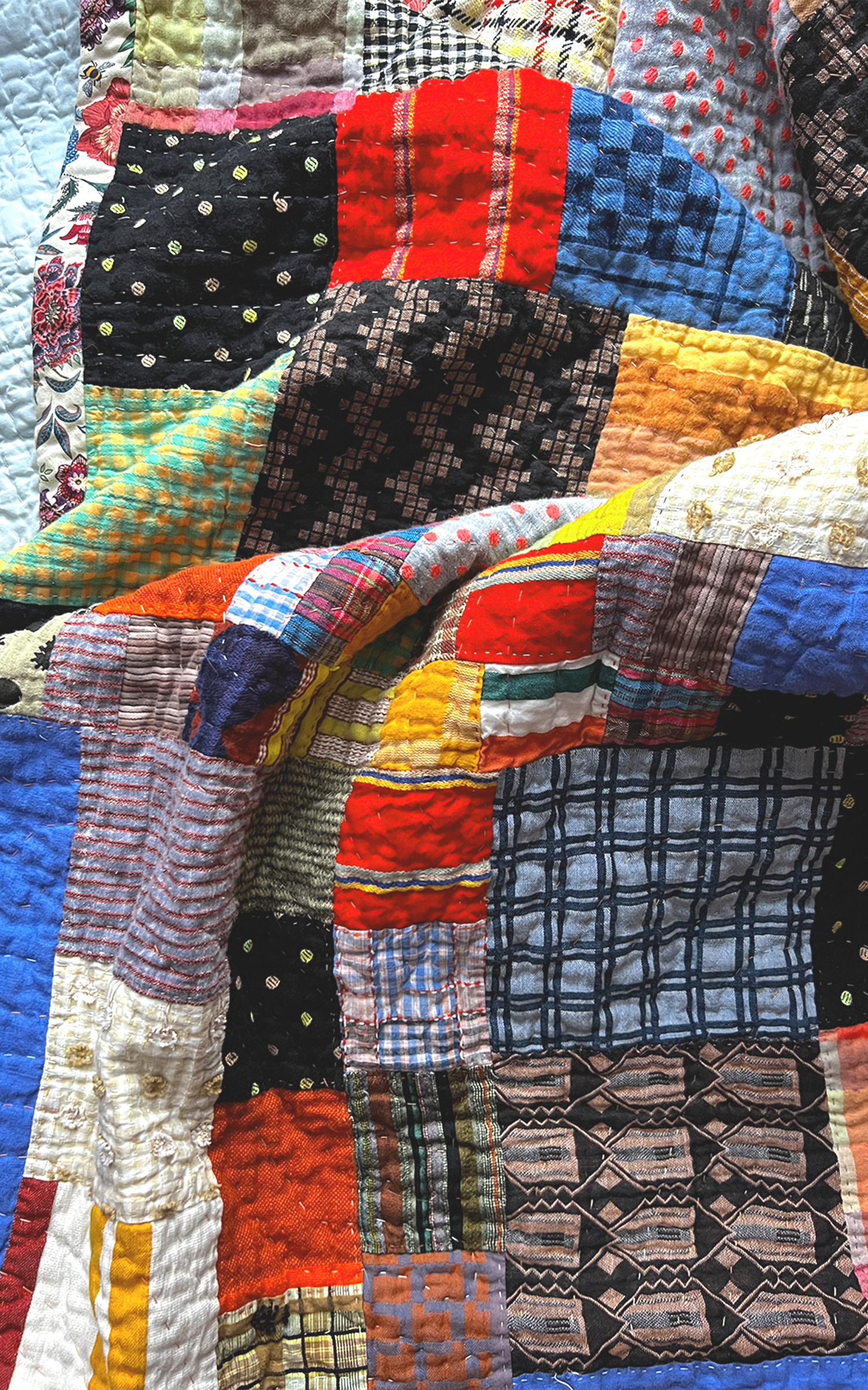 The piece is hand quilted. The batting is 100% cotton. The scrap side is primarily cotton and hemp, with a few textiles from the Ace & Jig collections containing poly or metallic fibers. The backing and binding are also cotton.