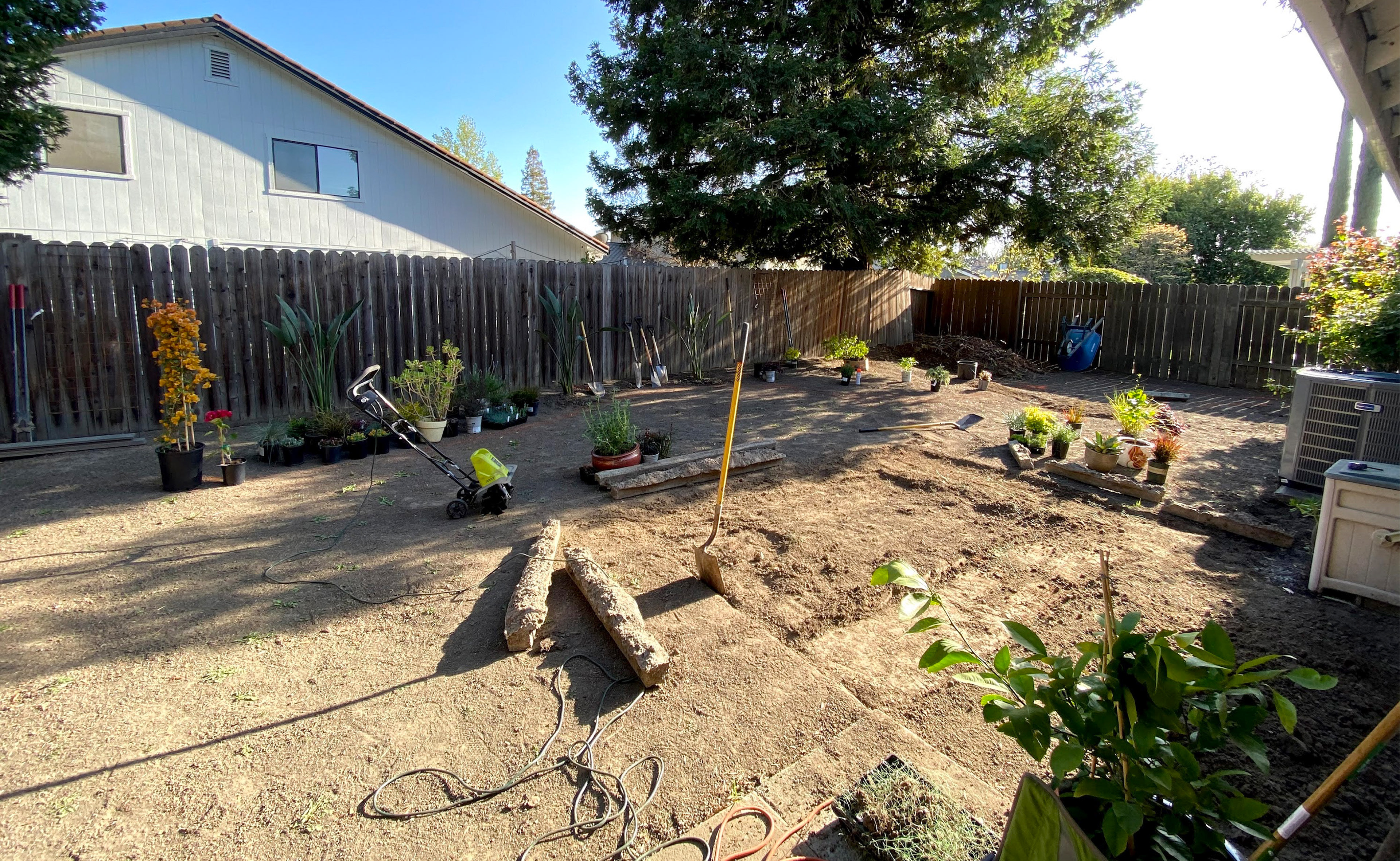 We used landscape spray to mark the dirt divided and transplanted an existing Bird of Paradise (Strelitzia sp.) and rearranged the plants until we liked the layout. We excavated the paths and seating areas a few inches so we could add decomposed granite (DG.) We added edging to define the planting beds, adding soil to some to create mounds. Custom raised beds were made with 4x4 and 2x8 redwood boards. Landscape fabric was added to the planting beds between the soil and gravel.