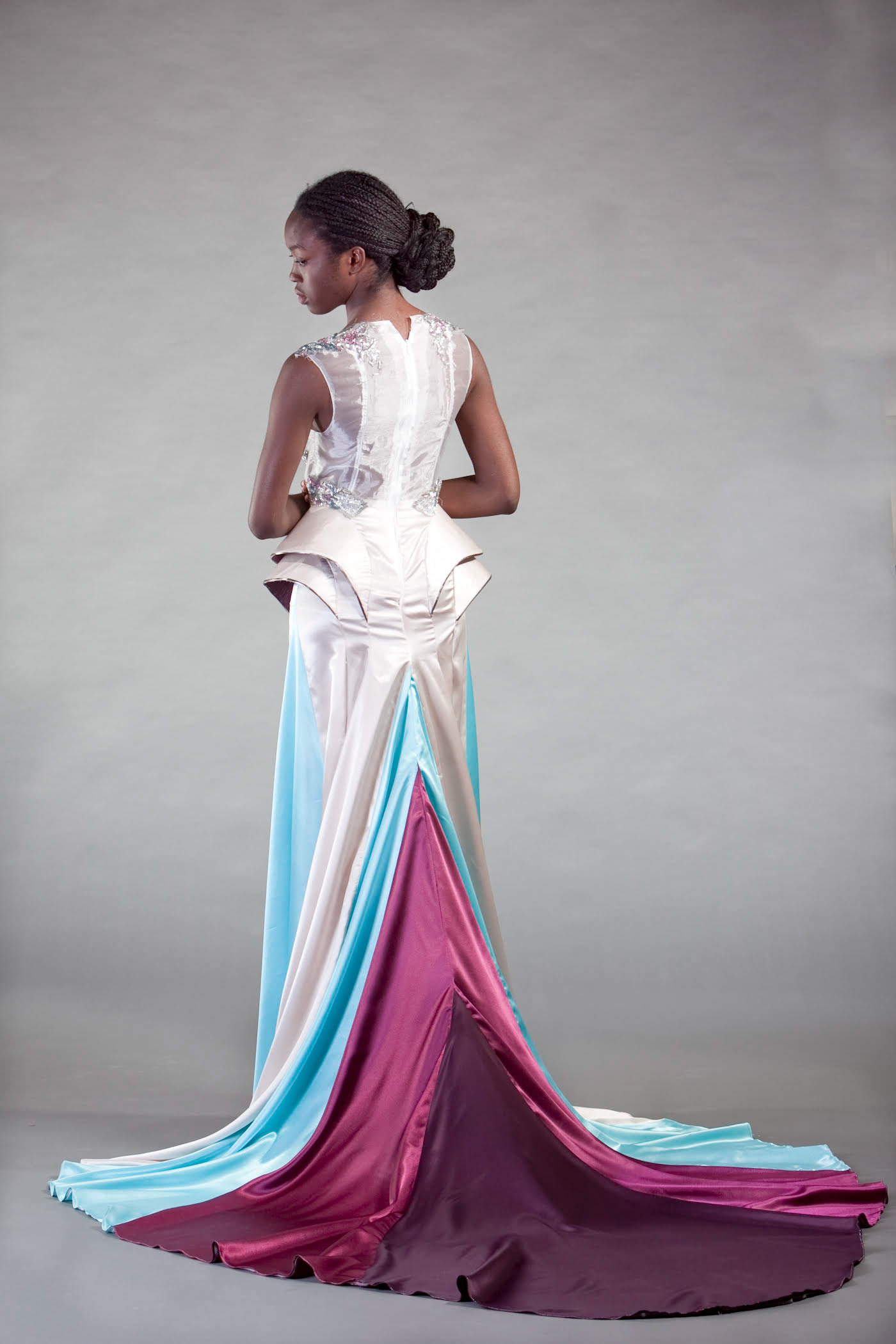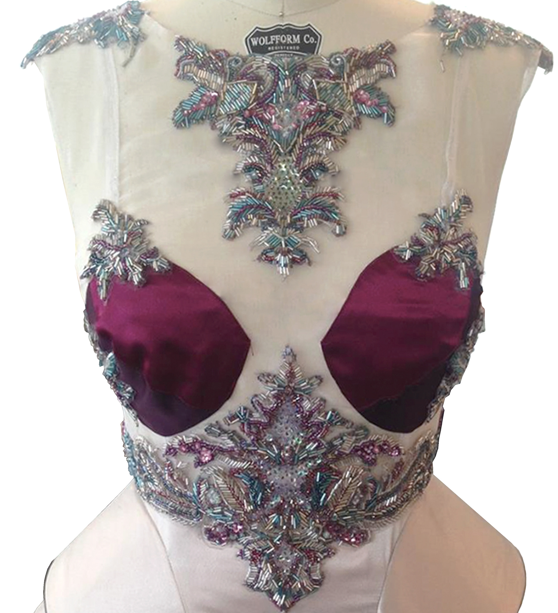 The structures along the hips were carefully shaped to accentuate the curves of the body and incorporated several layers of interfacing. The appliques were beaded by hand and included over 10 varieties of beads and sequins.