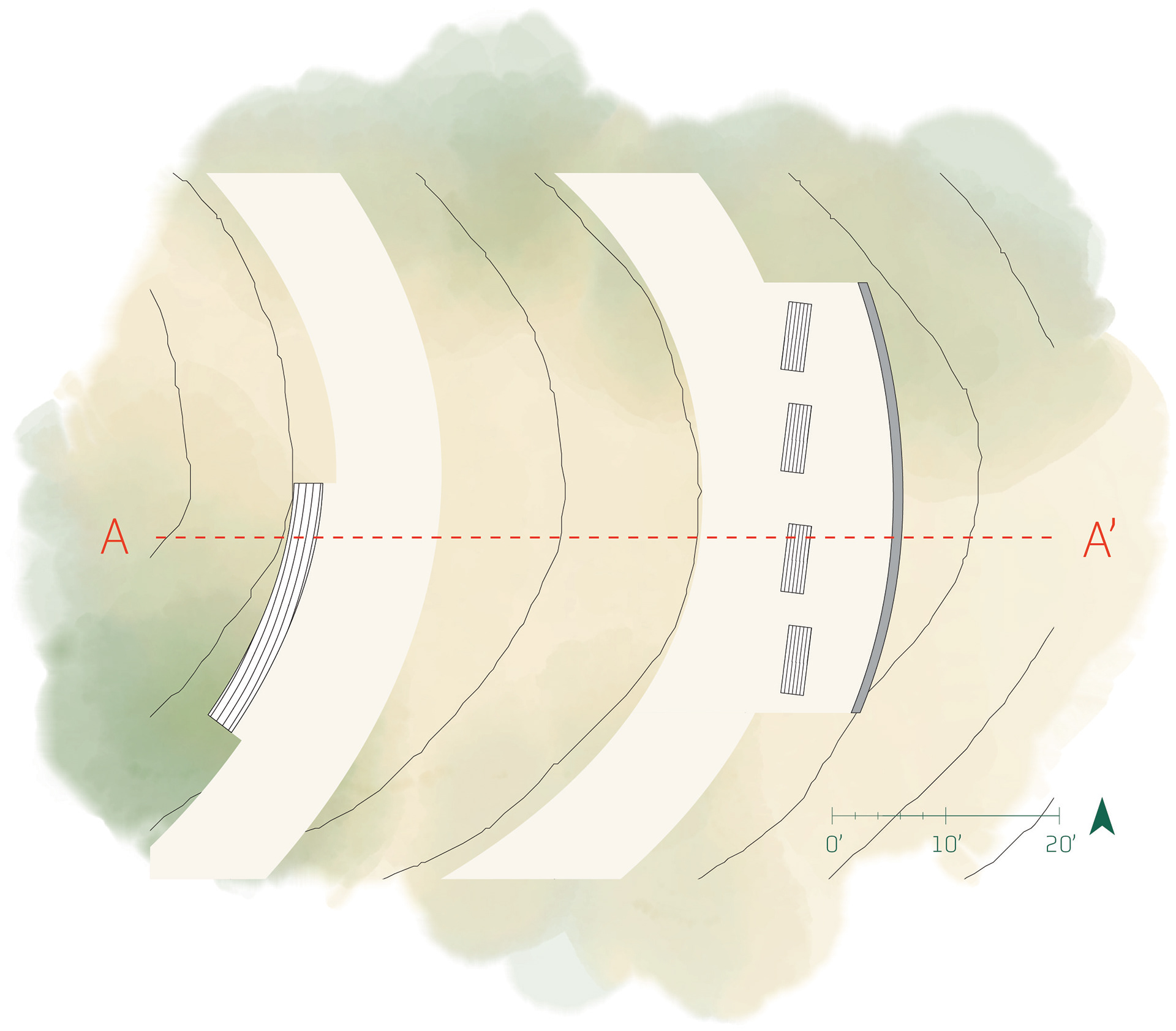 A CLOSE UP OF THE UNIVERSAL ACCESS TRAIL (LEFT) SHOWS THE VARIOUS LOOKOUT SPOTS AND SEATING OPTIONS. THE TRAIL IS MADE OF DECOMPOSED GRANITE, STONES, AND THE SEATS FROM WOOD HARVESTED FROM THE SITE DURING TRAIL CONSTRUCTION.