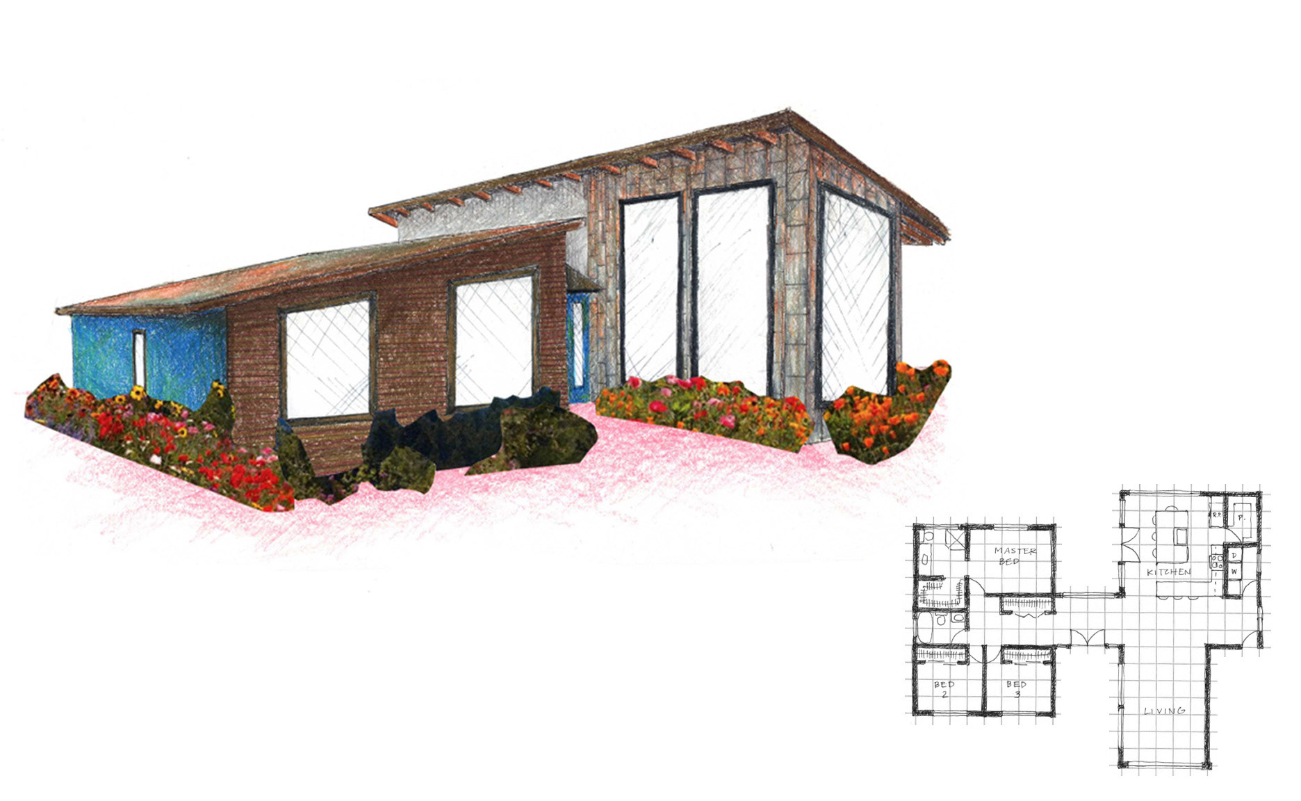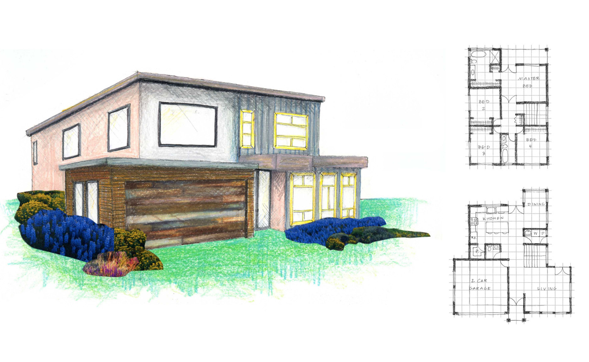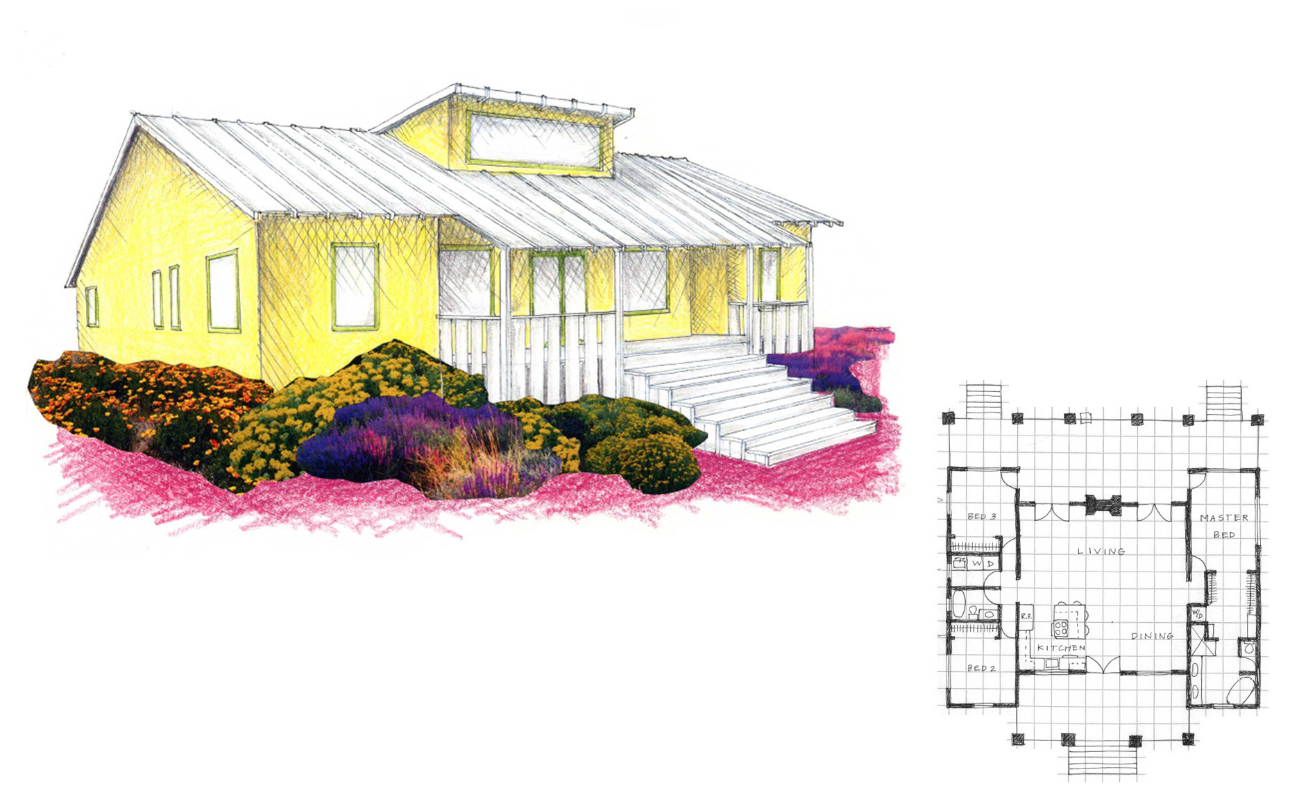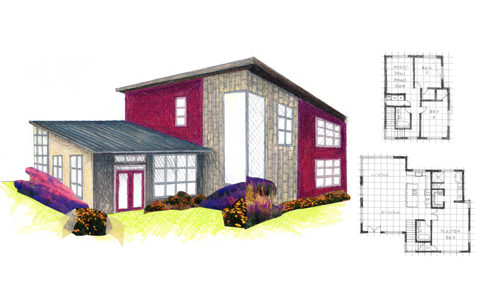 These houses were developed alongside ready-to-wear and eveningwear lines as part of my collections course. I used colored pencils for the perspectives and collaged the plantings with magazine cutouts.