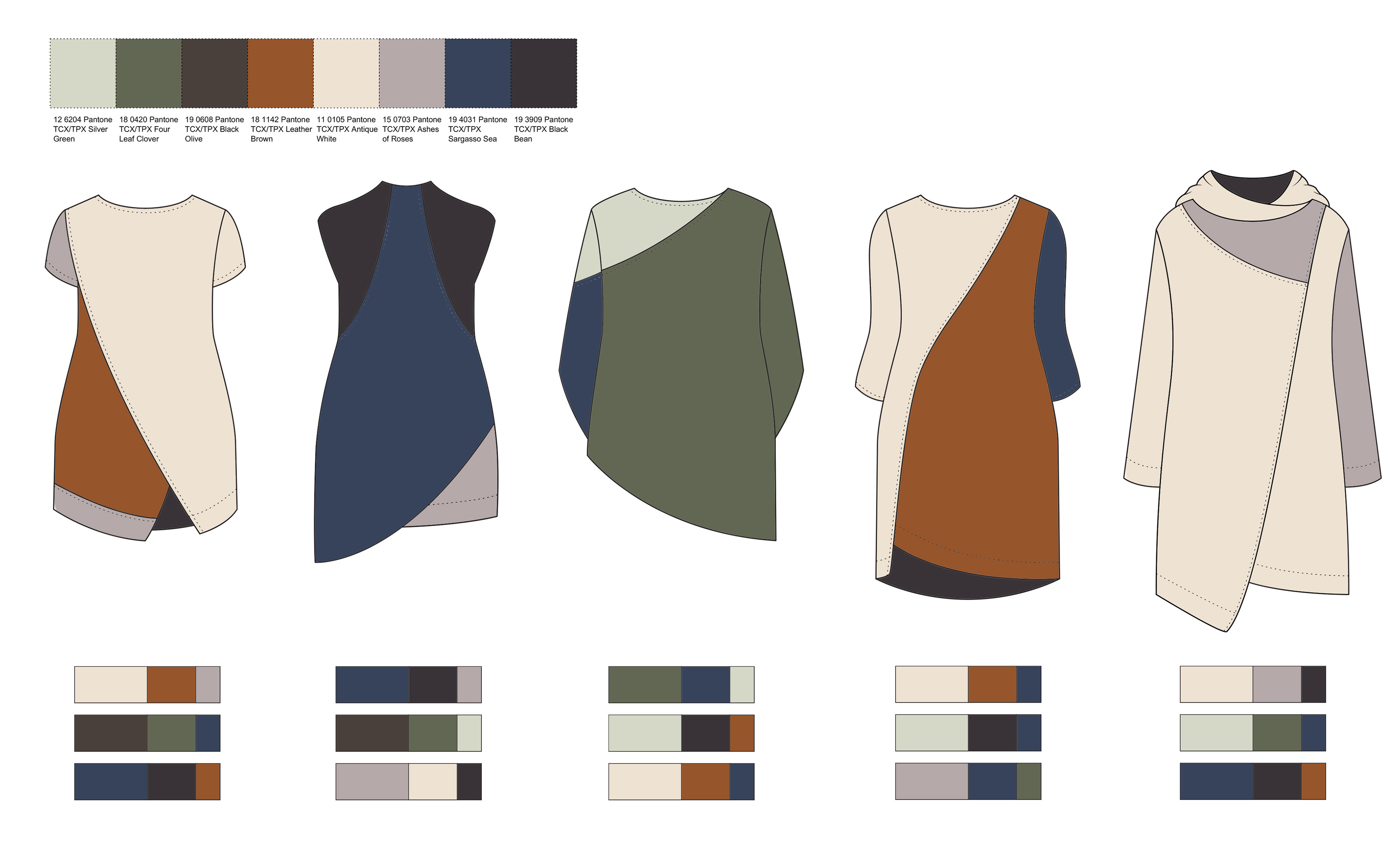 Below is the mood board containing inspiration for materials, silhouettes, colors, and overall feel. Colors were chosen based on WGSN forecasted colors for the upcoming seasons. The final silhouettes were chosen to provide a variety of looks and lengths and were asymmetric to adapt to the body throughout pregnancy and afterward.