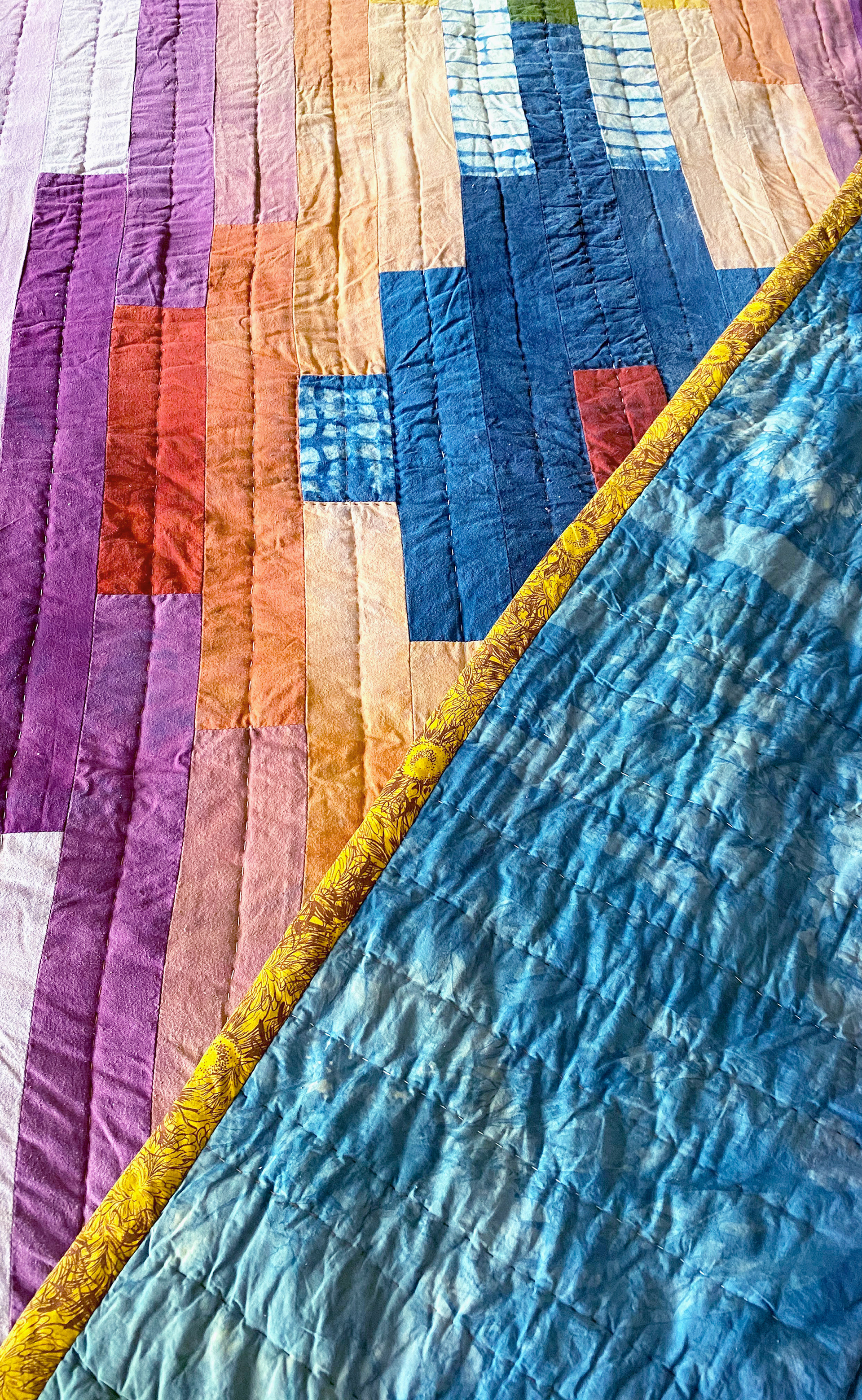 The quilt was a labor of love and incorporated natural materials and dyes. After cutting, mordanting, and dyeing the strips according to the design, I sewed the strips together with my 1970s Singer. I layered the bottom layer, a sheet dyed with indigo, two layers of batting, and the top layer and pinned them together using special quilting safety pins. I hand-quilted the layers together using off-white, orange, and navy cotton quilting thread. I trimmed the batting and attached the bias binding, made of printed cotton from the fabric store.