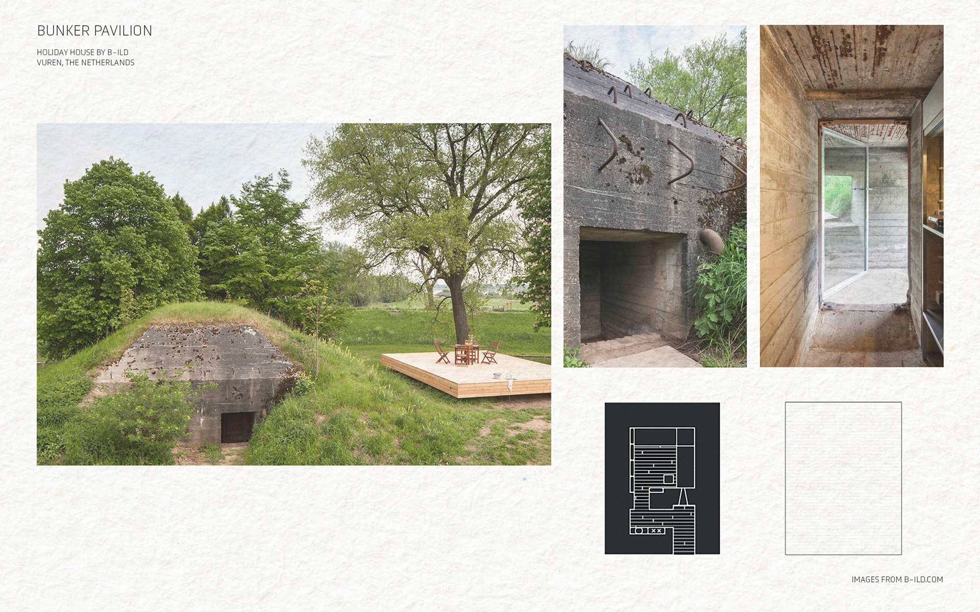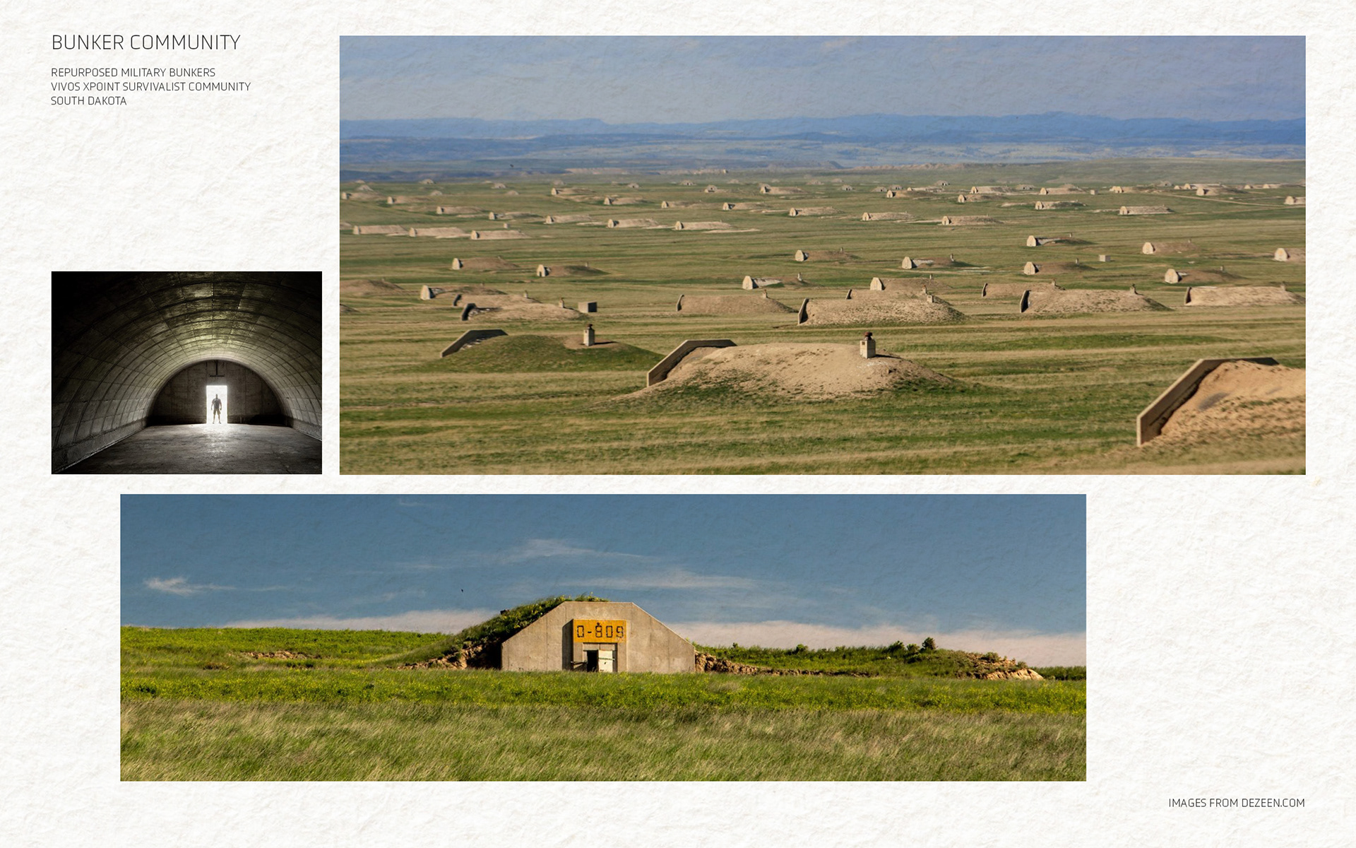 B-ILD's Bunker Pavilion, an earth-sheltered home in Princeton, MA, dome home in Texas, and the Vivos xPoint Bunker Community in South Dakota.