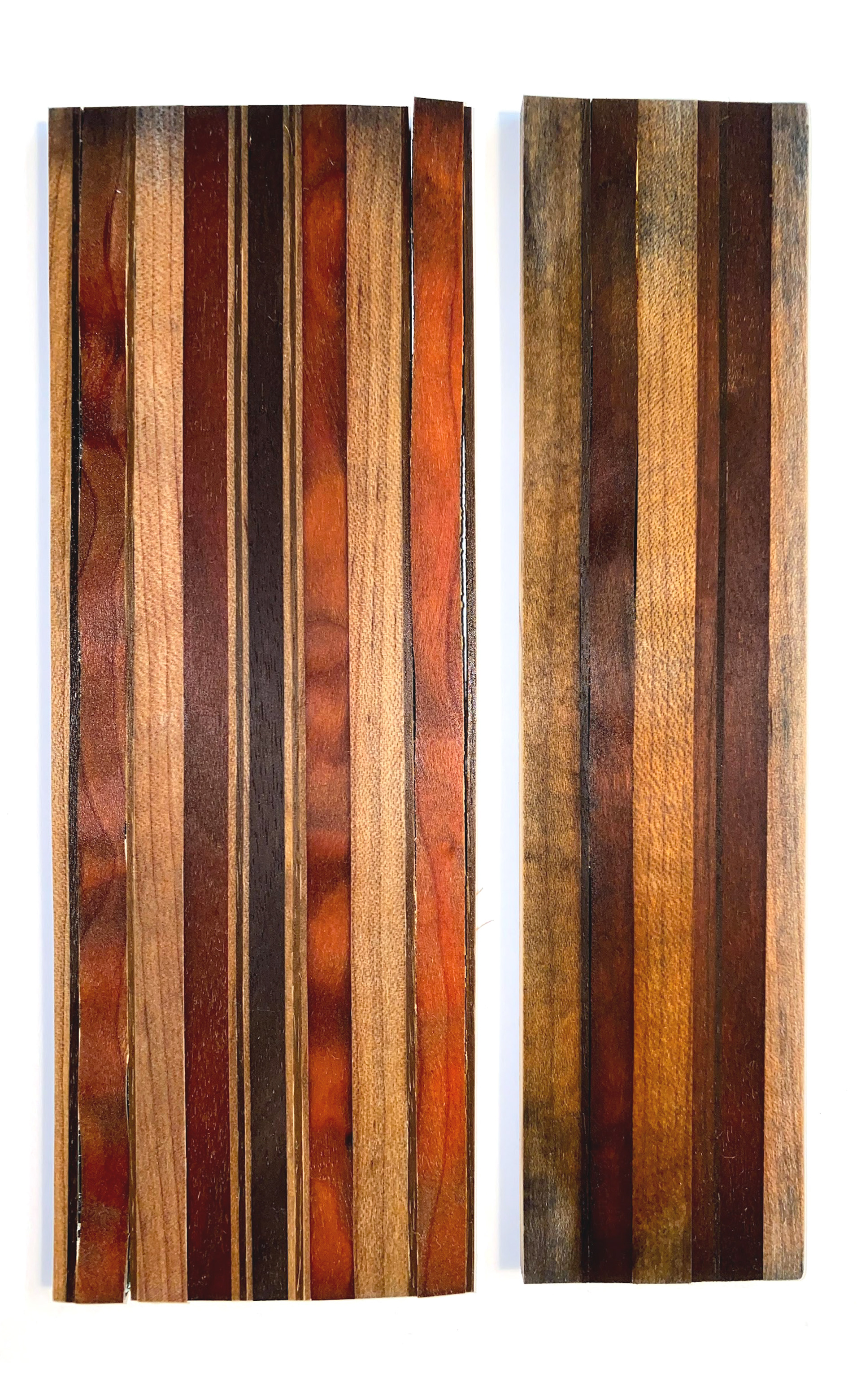 I was experimenting with indigo applications on wood at the time and added this piece to a cold indigo vat for over 24 hours. As a result, the piece warped and some of the glue joints failed. I allowed the scraps to dry, pulled the failed joints apart, reglued the scraps, and sanded the piece down again.